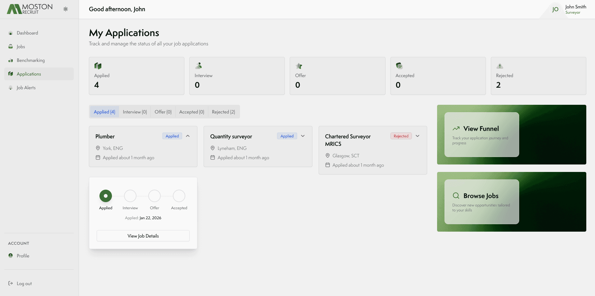 The recruitment funnel view shows you exactly where you stand across every live application at a glance.